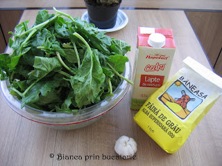 Ingrediente: 2 kg spanac, 4 catei de usturoi, o lingura cu varf de faina, 800 ml lapte. Este portie dubla.